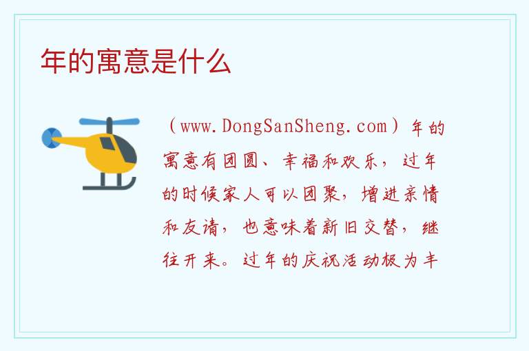 年的寓意有团圆、幸福和欢乐,过年的时候家人可以团聚,增进亲情和友请,也意味着新旧交替,继往开来。过年的庆祝活动极为丰富多样,有舞狮、飘色、舞龙、游神、庙会、逛花街、赏花灯、游锣鼓、游标旗、烧烟花、祈福等。