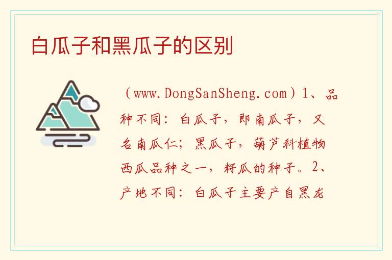 2、产地不同:白瓜子主要产自黑龙江与内蒙古,产自这两地的白瓜子品质上乘;黑瓜子主要产地位于甘肃民勤。