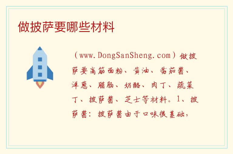 做披萨要高筋面粉、黄油、番茄酱、洋葱、腊肠、奶酪、肉丁、蔬菜丁、披萨酱、芝士等材料。