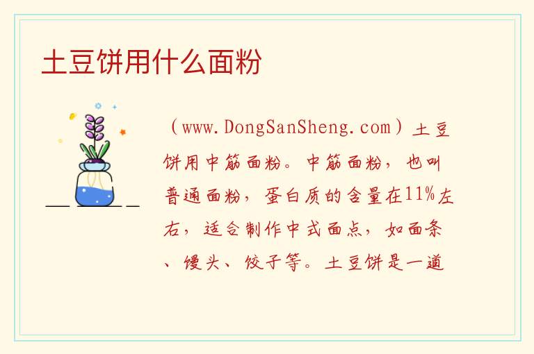 土豆饼用中筋面粉。中筋面粉,也叫普通面粉,蛋白质的含量在11%左右,适合制作中式面点,如面条、馒头、饺子等。土豆饼是一道以土豆、鸡蛋、面粉作为主要食材,制作而成的美食,源自安徽和广东广州的传统小吃,属于徽菜、粤菜系。土豆饼口味鲜美、营养丰富,是深受喜爱的小吃。