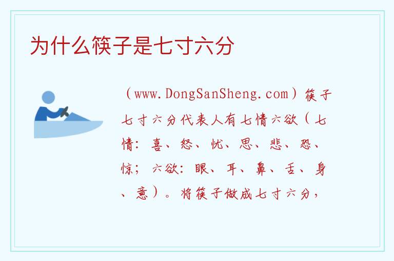筷子七寸六分代表人有七情六欲(七情:喜、怒、忧、思、悲、恐、惊;六欲:眼、耳、鼻、舌、身、意)。将筷子做成七寸六分,是为提醒人们要克己复礼,节制欲望,不要暴饮暴食。筷子,是指中国常用的饮食工具,通常由竹、木、骨、瓷、象牙、金属、塑料等材料制作。是世界上常用餐具之一,中华饮食文化的标志之一,发明于中国,后传至朝鲜、日本、越南等汉字文化圈。