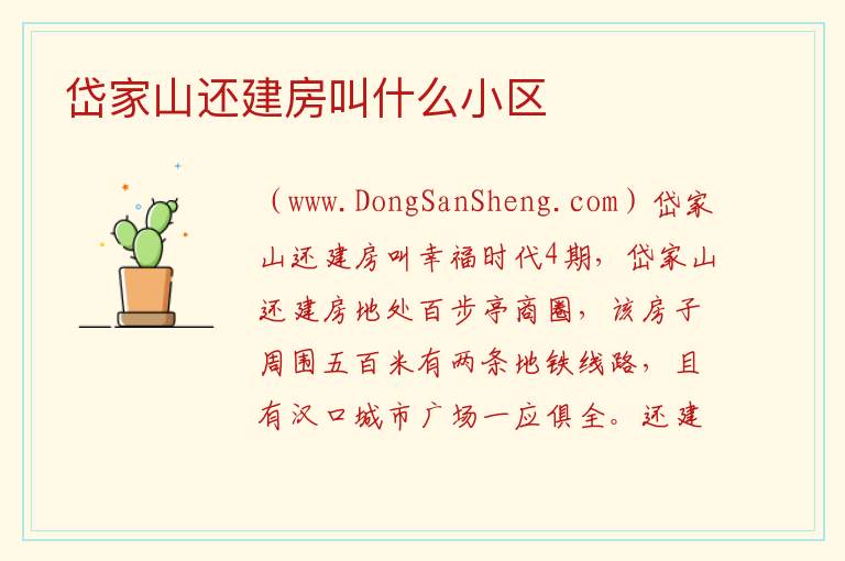 岱家山还建房叫幸福时代4期,岱家山还建房地处百步亭商圈,该房子周围五百米有两条地铁线路,且有汉口城市广场一应俱全。