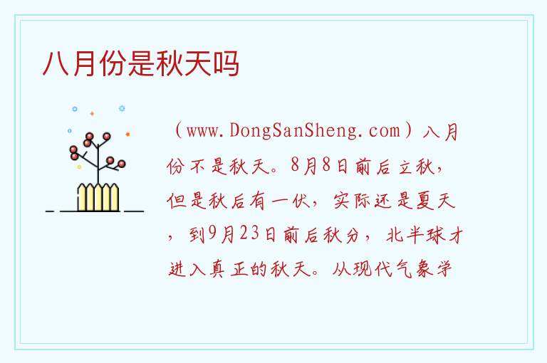 八月份不是秋天。8月8日前后立秋,但是秋后有一伏,实际还是夏天,到9月23日前后秋分,北半球才进入真正的秋天。从现代气象学上划分,北温带的秋季在8月23日(处暑)~11月22日(小雪);南温带的秋季在2月19日(北半球雨水)~5月21日(北半球小满)。