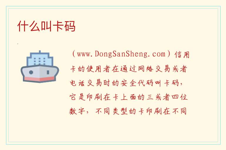 信用卡的使用者在通过网络交易或者电话交易时的安全代码叫卡码,它是印刷在卡上面的三或者四位数字,不同类型的卡印刷在不同的位置。它通常是为了防止使用者被欺诈,证明在付款时使用卡片的是卡主本人。信用卡安全码也是信用卡的身份证明,对于消费交易起到很重要的作用。