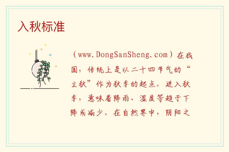 在我国,传统上是以二十四节气的“立秋”作为秋季的起点。进入秋季,意味着降雨、湿度等趋于下降或减少。在自然界中,阴阳之气开始转变,阳气渐退,阴气渐生,气候由热转寒,万物随寒气增长,逐渐萧落。