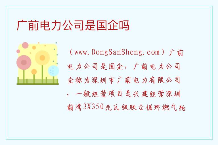 广前电力公司是国企,广前电力公司全称为深圳市广前电力有限公司,一般经营项目是兴建经营深圳前湾3X350兆瓦级联合循环燃气轮机发电厂。国企一般指国有企业,是指国务院和地方人民政府分别代表国家履行出资人职责的国有独资企业、国有独资公司以及国有资本控股公司,包括中央和地方国有资产监督管理机构和其他部门所监管的企业本级及其逐级投资形成的企业。国有企业作为一种生产经营组织形式,同时具有商业类和公益类的特点,其商业性体现为追求国有资产的保值和增值,其公益性体现为国有企业的设立通常是为了实现国家调节经济的目标,起着调和国民经济各个方面发展的作用。