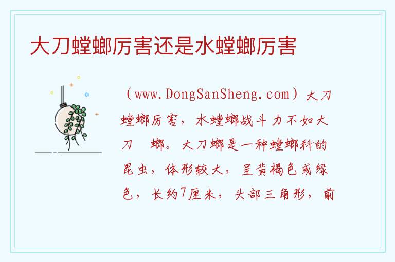 大刀螳螂厉害,水螳螂战斗力不如大刀蟐螂。大刀螂是一种螳螂科的昆虫,体形较大,呈黄褐色或绿色,长约7厘米,头部三角形,前胸背板、肩部较发达。后部至前肢基部稍宽。前胸细长,侧缘有细齿排列。水螳螂中文学名中华螳蝎蝽,也叫螳蛉蝽,半翅目昆虫。和红娘华一样以呼吸管伸出水面呼吸,平时栖息在静水域的水草丛间。水螳螂属肉食性昆虫,强而有力的镰刀状前脚是它的锐利武器。