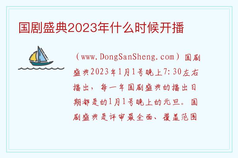 国剧盛典2023年1月1号晚上7:30左右播出,每一年国剧盛典的播出日期都是的1月1号晚上的元旦。国剧盛典是评审最全面、覆盖范围最广的电视剧评选活动。由中国安徽卫视主办,光线传媒承办、首都广播电视节目制作业协会协办。2008年,为纪念中国电视剧辉煌三十年的历史节点,带领全中国的观众重温电视剧改变生活的三十年,主题为《国剧盛典回响30年》。评选奖项分为三大类共计约30个小项,依据电视收视率和影响力打分评出,其中专业奖由各地电视台购片部负责人打分,网络奖由网络流量和网友共同决定,组委会奖由专家和评委会成员评出。
