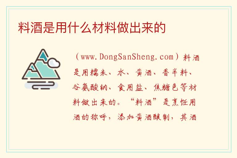 料酒是用糯米、水、黄酒、香辛料、谷氨酸钠、食用盐、焦糖色等材料做出来的。“料酒”是烹饪用酒的称呼,添加黄酒酿制,其酒精浓度低,含量在15%以下,而酯类含量高,富含氨基酸。在烹制菜肴中使用广泛。料酒的调味作用主要为去腥、增香。