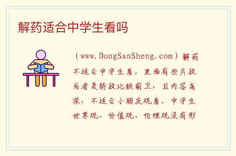 解药不适合中学生看。里面有些片段或者是桥段比较前卫,且内容高深,不适合小朋友观看。中学生世界观、价值观、伦理观没有形成,一是看不懂,二是容易扭曲价值观。中学生是指接受中等教育的学生,年龄一般为12-18岁左右。在中国大陆中学教育由初级中学(初中)和高级中学(高中)组成。另有同名杂志。初中生读完初三后会有以升入高中的中考,成绩上线者可以进入高中或中等职业技术学院,甚至部分大专院校还可以直接招收一些初中毕业生进行五年制的大专课程。