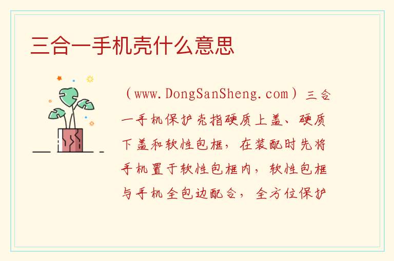 三合一手机保护壳指硬质上盖、硬质下盖和软性包框,在装配时先将手机置于软性包框内,软性包框与手机全包边配合,全方位保护手机。