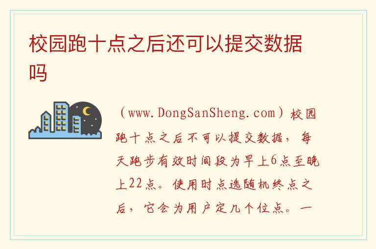 校园跑十点之后不可以提交数据,每天跑步有效时间段为早上6点至晚上22点。使用时点选随机终点之后,它会为用户定几个位点。一个绿色必经位点,必须经过两个蓝色位点。如果定出的位点不是自己想要的,可以退出重新定过。一般在田径场上定位的时候,所有的位点都会在田径场上。此外必须完成所选公里数,经过至少3个感应点位,经过的3个感应点位中至少有1个必经点位,配速在2分钟11秒每公里-10分钟每公里,才会被认定为有效成绩,才可以上传。