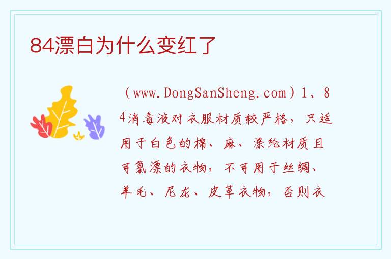 1、84消毒液对衣服材质较严格,只适用于白色的棉、麻、涤纶材质且可氯漂的衣物,不可用于丝绸、羊毛、尼龙、皮革衣物,否则衣服会被损坏,也不可用于彩色衣物,否则会使衣物褪色,如黑色衣物会变成淡红色。