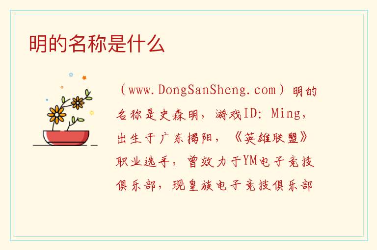 明的名称是史森明,游戏ID:Ming,出生于广东揭阳,《英雄联盟》职业选手,曾效力于YM电子竞技俱乐部,现皇族电子竞技俱乐部英雄联盟分部辅助选手。2015年史森明以自由人身份加入MGB战队,开始自己的职业生涯。在2019年取得LPL夏季赛亚军、德玛西亚杯冠军。在2021年取得2021LPL春季赛冠军、2021英雄联盟季中冠军赛冠军。