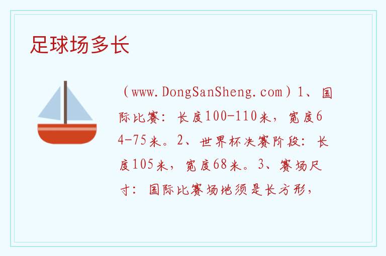 3、赛场尺寸:国际比赛场地须是长方形,边线的长度须长于球门线的长度。长度90-120米,宽度45-90米。
