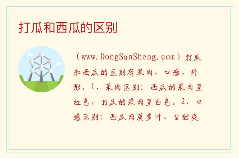 打瓜和西瓜的区别有果肉、口感、外形。1、果肉区别:西瓜的果肉呈红色,打瓜的果肉呈白色。2、口感区别:西瓜肉质多汁、甘甜爽口。打瓜不如西瓜甘甜,糖分少于西瓜。3、外形区别:西瓜近于球形或椭圆形果皮光滑,色泽及纹饰各式。打瓜瓜圆形,表皮光滑,浅绿色,有深绿色条纹。...