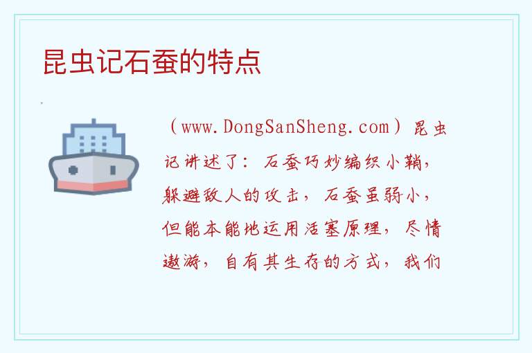 昆虫记讲述了:石蚕巧妙编织小鞘,躲避敌人的攻击,石蚕虽弱小,但能本能地运用活塞原理,尽情遨游,自有其生存的方式,我们任何生命都有自然存在的理由。石蚕的聪明自信可爱,自然界每种物种都有存在的理由,要和自然和谐相处。...