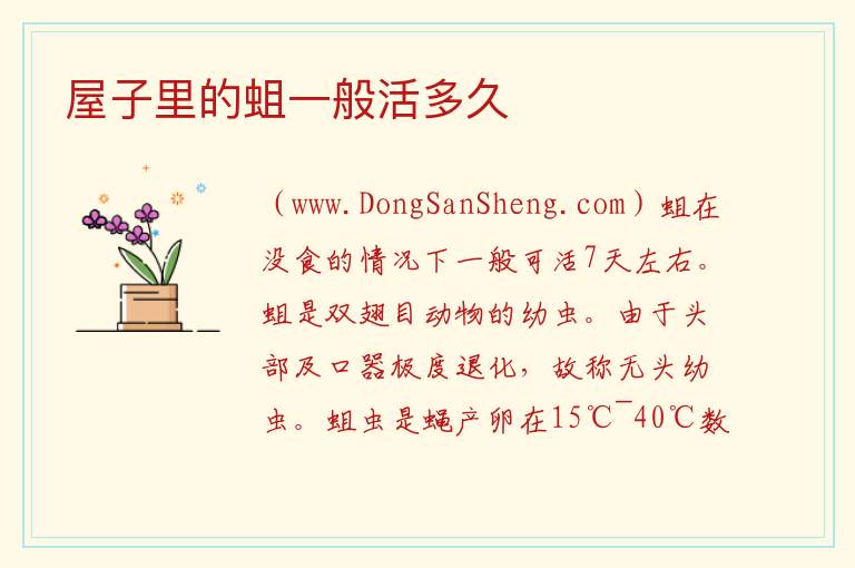 蛆在没食的情况下一般可活7天左右。蛆是双翅目动物的幼虫。由于头部及口器极度退化,故称无头幼虫。蛆虫是蝇产卵在15℃~40℃数小时后孵化的,长约两厘米,通过蠕动行走。蛆含有丰富的蛋白质,可入药也可供食用。蛆是蝇蛆病病原体,蝇的幼虫。...