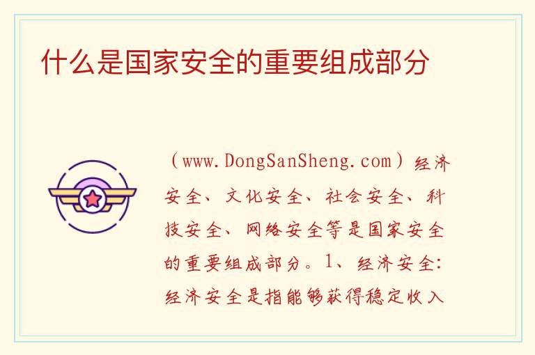 经济安全、文化安全、社会安全、科技安全、网络安全等是国家安全的重要组成部分。1、经济安全:经济安全是指能够获得稳定收入或其他资源,从而确保在及可预见的将来能够维持一定的生活标准。2、文化安全:文化安全是指一国的观念形态的文化,如民族精神、政治价值理念、信仰追求等,生存和发展不受威胁的客观状态。3、社会安全:社会安全是衡量一个国家或地区,构成社会安全四个基本方面的综合性指数,包括社会治安、交通安全、...