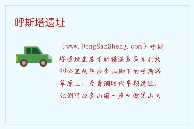 呼斯塔遗址坐落于新疆温泉县东北约40公里的阿拉套山脚下的呼斯塔草原上,是青铜时代早期遗址。北侧阿拉套山前一座叫做黑山头的120米高的山顶上有一处平面呈不规则“田字形居址;南侧距黑山头直线距离4公里的一座高60米的山顶上有一座长方形的居址,接近山顶的位置还分布有一条长约百余米的石墙围护着山顶的居址;南北两侧山顶居址拱卫下的阿拉套山冲积扇就是呼斯塔遗址最重要的组成部分,分布着大大小小、形状各异的石构居...